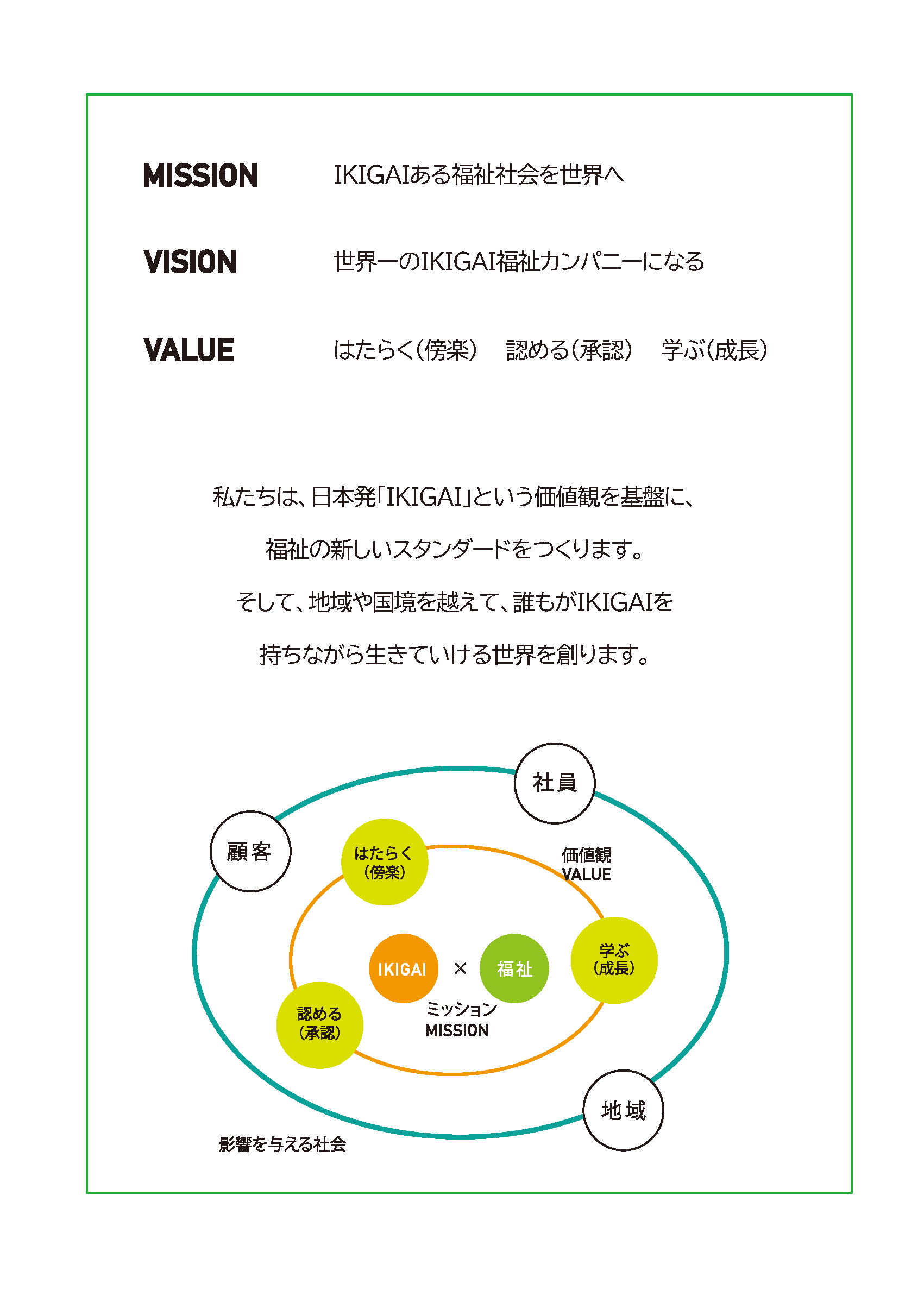 私達はお客様、地域社会そして従業員の期待とニーズに応えるために、介護サービスのみならず様々な事業を創出し、夢と希望を与えることができる企業として邁進致します。
