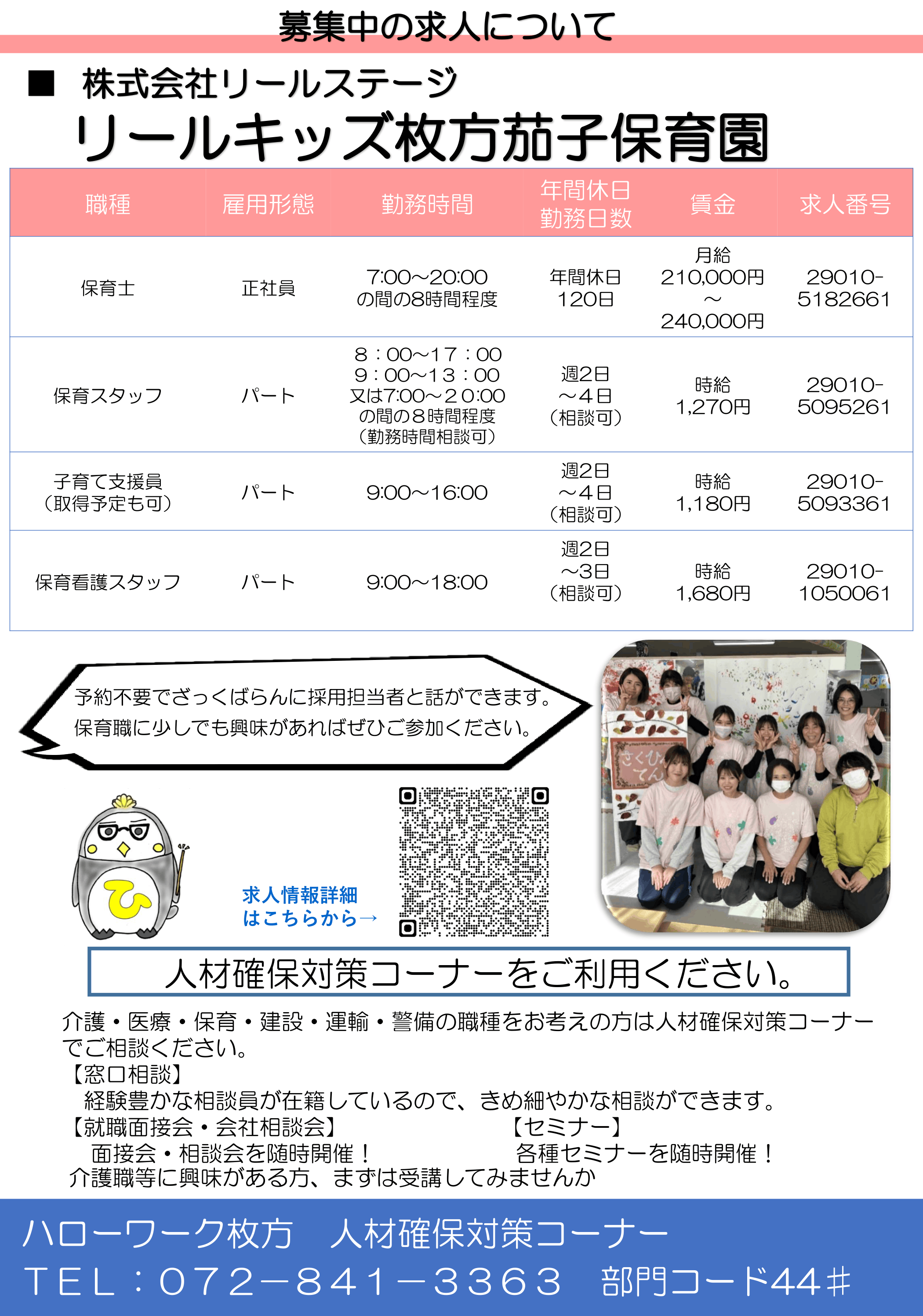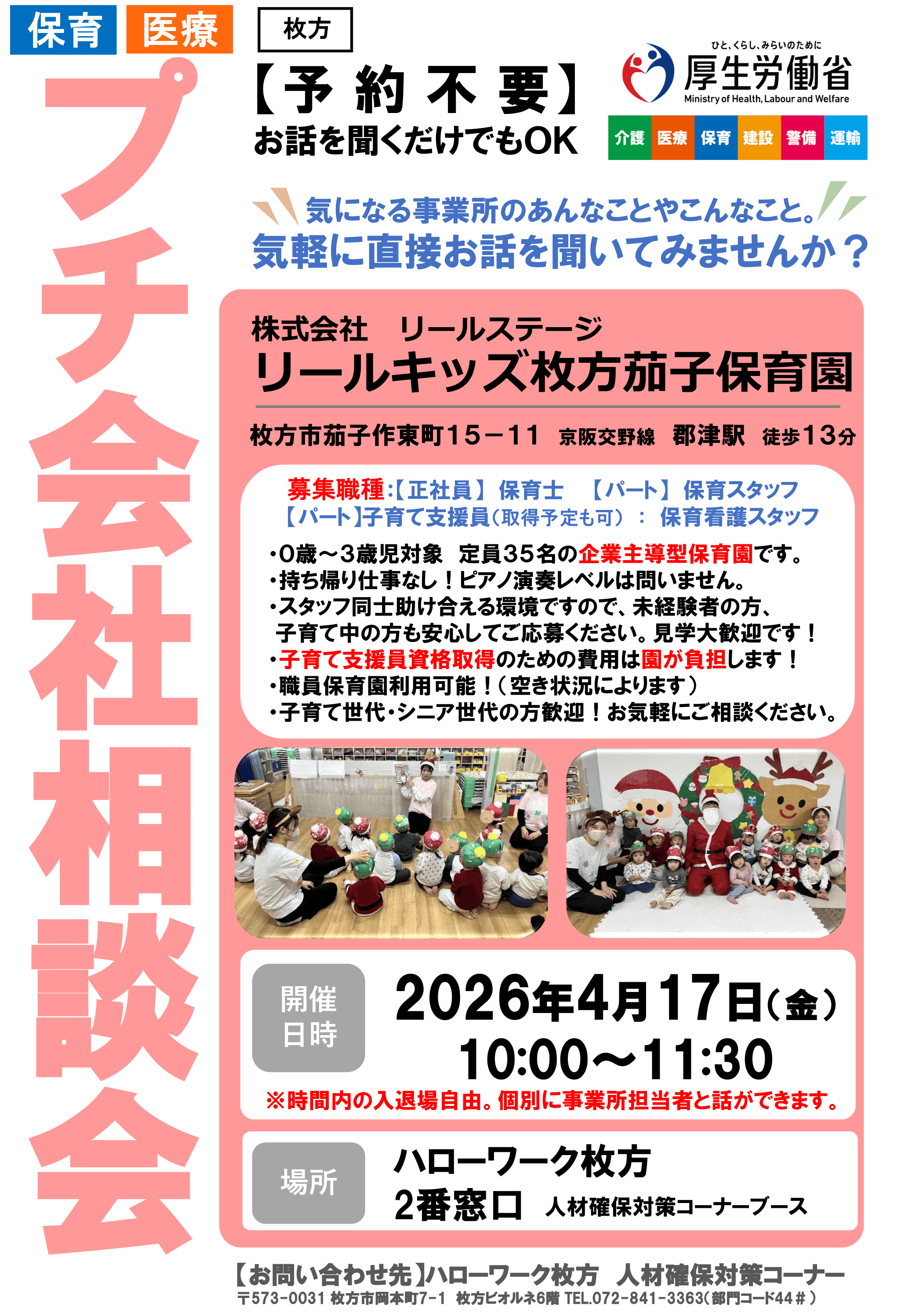 日時:2026年4月17日(金)場所:ハローワーク枚方 2番窓口 人材確保対策コーナー 枚方市岡本町7-1 枚方ビオルネ6階 ℡072-841-3363(部門コード44#)